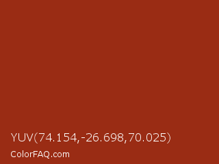 YUV 74.154,-26.698,70.025 Color is a normal red color and the nearest color is Tabasco #a02712. Hex code #9a2c14 and RGB value is rgb(154,44,20). In RGB color space, this color is composed of 60% red, 17% green, 8% blue, In CMYK color space, this color is composed of 0% cyan, 71% magenta, 87% yellow , 40% black , In HSL color space, this color has a hue angle of 11° , 77% saturation and 34% lightness.