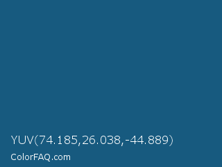 YUV 74.185,26.038,-44.889 Color is a dark blue color and the nearest color is Blumine #18587a. Hex code #175a7f and RGB value is rgb(23,90,127). In RGB color space, this color is composed of 9% red, 35% green, 50% blue, In CMYK color space, this color is composed of 82% cyan, 29% magenta, 0% yellow , 50% black , In HSL color space, this color has a hue angle of 201° , 69% saturation and 29% lightness.
