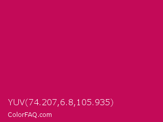 YUV 74.207,6.8,105.935 Color is a normal rose color and the nearest color is Pictorial Carmine #c30b4e. Hex code #c30a58 and RGB value is rgb(195,10,88). In RGB color space, this color is composed of 76% red, 4% green, 35% blue, In CMYK color space, this color is composed of 0% cyan, 95% magenta, 55% yellow , 24% black , In HSL color space, this color has a hue angle of 335° , 90% saturation and 40% lightness.
