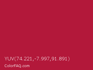 YUV 74.221,-7.997,91.891 Color is a normal red color and the nearest color is Deep Carmine #a9203e. Hex code #b3183a and RGB value is rgb(179,24,58). In RGB color space, this color is composed of 70% red, 9% green, 23% blue, In CMYK color space, this color is composed of 0% cyan, 87% magenta, 68% yellow , 30% black , In HSL color space, this color has a hue angle of 347° , 76% saturation and 40% lightness.