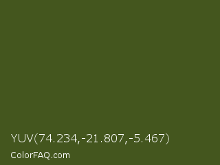 YUV 74.234,-21.807,-5.467 Color is a dark lime color and the nearest color is Army Green #4b5320. Hex code #44561e and RGB value is rgb(68,86,30). In RGB color space, this color is composed of 27% red, 34% green, 12% blue, In CMYK color space, this color is composed of 21% cyan, 0% magenta, 65% yellow , 66% black , In HSL color space, this color has a hue angle of 79° , 48% saturation and 23% lightness.