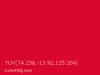 YUV 74.236,-13.92,125.204 Color is a normal red color and the nearest color is Medium Candy Apple Red #e2062c. Hex code #d9072e and RGB value is rgb(217,7,46). In RGB color space, this color is composed of 85% red, 3% green, 18% blue, In CMYK color space, this color is composed of 0% cyan, 97% magenta, 79% yellow , 15% black , In HSL color space, this color has a hue angle of 349° , 94% saturation and 44% lightness.
