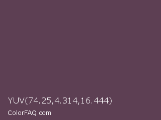 YUV 74.25,4.314,16.444 Color is a normal magenta color and the nearest color is Eggplant #614051. Hex code #5d3f53 and RGB value is rgb(93,63,83). In RGB color space, this color is composed of 36% red, 25% green, 33% blue, In CMYK color space, this color is composed of 0% cyan, 32% magenta, 11% yellow , 64% black , In HSL color space, this color has a hue angle of 320° , 19% saturation and 31% lightness.