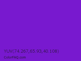 YUV 74.267,65.93,40.108 Color is a normal purple color and the nearest color is French Violet #8806ce. Hex code #7819d0 and RGB value is rgb(120,25,208). In RGB color space, this color is composed of 47% red, 10% green, 82% blue, In CMYK color space, this color is composed of 42% cyan, 88% magenta, 0% yellow , 18% black , In HSL color space, this color has a hue angle of 271° , 79% saturation and 46% lightness.