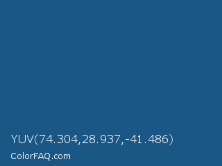 YUV 74.304,28.937,-41.486 Color is a normal blue color and the nearest color is Blumine #18587a. Hex code #1b5785 and RGB value is rgb(27,87,133). In RGB color space, this color is composed of 11% red, 34% green, 52% blue, In CMYK color space, this color is composed of 80% cyan, 35% magenta, 0% yellow , 48% black , In HSL color space, this color has a hue angle of 206° , 66% saturation and 31% lightness.