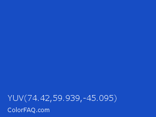 YUV 74.42,59.939,-45.095 Color is a normal blue color and the nearest color is New Car #214fc6. Hex code #174dc4 and RGB value is rgb(23,77,196). In RGB color space, this color is composed of 9% red, 30% green, 77% blue, In CMYK color space, this color is composed of 88% cyan, 61% magenta, 0% yellow , 23% black , In HSL color space, this color has a hue angle of 221° , 79% saturation and 43% lightness.