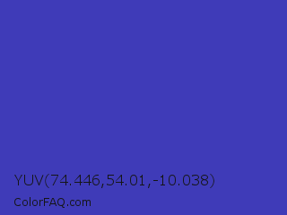 YUV 74.446,54.01,-10.038 Color is a normal indigo color and the nearest color is Governor Bay #2f3cb3. Hex code #3f3bb8 and RGB value is rgb(63,59,184). In RGB color space, this color is composed of 25% red, 23% green, 72% blue, In CMYK color space, this color is composed of 66% cyan, 68% magenta, 0% yellow , 28% black , In HSL color space, this color has a hue angle of 242° , 51% saturation and 48% lightness.