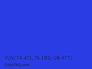 YUV 74.471,76.183,-28.477 Color is a normal blue color and the nearest color is Palatinate Blue #273be2. Hex code #2a3de5 and RGB value is rgb(42,61,229). In RGB color space, this color is composed of 16% red, 24% green, 90% blue, In CMYK color space, this color is composed of 82% cyan, 73% magenta, 0% yellow , 10% black , In HSL color space, this color has a hue angle of 234° , 78% saturation and 53% lightness.