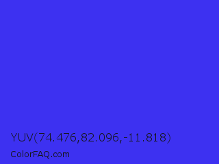 YUV 74.476,82.096,-11.818 Color is a normal indigo color and the nearest color is Palatinate Blue #273be2. Hex code #3d31f1 and RGB value is rgb(61,49,241). In RGB color space, this color is composed of 24% red, 19% green, 95% blue, In CMYK color space, this color is composed of 75% cyan, 80% magenta, 0% yellow , 5% black , In HSL color space, this color has a hue angle of 244° , 87% saturation and 57% lightness.