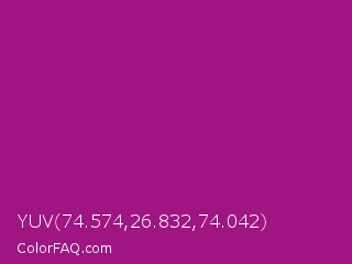 YUV 74.574,26.832,74.042 Color is a normal magenta color and the nearest color is Violet Eggplant #991199. Hex code #9f1581 and RGB value is rgb(159,21,129). In RGB color space, this color is composed of 62% red, 8% green, 51% blue, In CMYK color space, this color is composed of 0% cyan, 87% magenta, 19% yellow , 38% black , In HSL color space, this color has a hue angle of 313° , 77% saturation and 35% lightness.