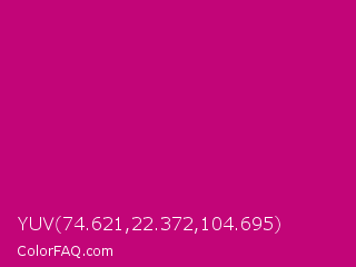 YUV 74.621,22.372,104.695 Color is a normal magenta color and the nearest color is Red Violet #c71585. Hex code #c20578 and RGB value is rgb(194,5,120). In RGB color space, this color is composed of 76% red, 2% green, 47% blue, In CMYK color space, this color is composed of 0% cyan, 97% magenta, 38% yellow , 24% black , In HSL color space, this color has a hue angle of 323° , 95% saturation and 39% lightness.