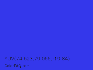 YUV 74.623,79.066,-19.84 Color is a normal blue color and the nearest color is Palatinate Blue #273be2. Hex code #3437eb and RGB value is rgb(52,55,235). In RGB color space, this color is composed of 20% red, 22% green, 92% blue, In CMYK color space, this color is composed of 78% cyan, 77% magenta, 0% yellow , 8% black , In HSL color space, this color has a hue angle of 239° , 82% saturation and 56% lightness.