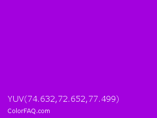 YUV 74.632,72.652,77.499 Color is a normal purple color and the nearest color is Dark Violet #9400d3. Hex code #a301de and RGB value is rgb(163,1,222). In RGB color space, this color is composed of 64% red, 0% green, 87% blue, In CMYK color space, this color is composed of 27% cyan, 100% magenta, 0% yellow , 13% black , In HSL color space, this color has a hue angle of 284° , 99% saturation and 44% lightness.