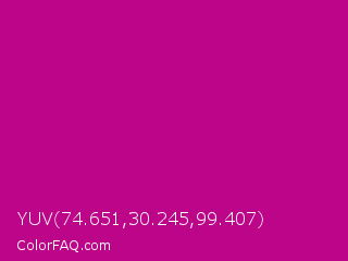 YUV 74.651,30.245,99.407 Color is a normal magenta color and the nearest color is Red Violet #c71585. Hex code #bc0588 and RGB value is rgb(188,5,136). In RGB color space, this color is composed of 74% red, 2% green, 53% blue, In CMYK color space, this color is composed of 0% cyan, 97% magenta, 28% yellow , 26% black , In HSL color space, this color has a hue angle of 317° , 95% saturation and 38% lightness.