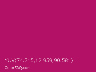 YUV 74.715,12.959,90.581 Color is a normal rose color and the nearest color is Lipstick #ab0563. Hex code #b21165 and RGB value is rgb(178,17,101). In RGB color space, this color is composed of 70% red, 7% green, 40% blue, In CMYK color space, this color is composed of 0% cyan, 90% magenta, 43% yellow , 30% black , In HSL color space, this color has a hue angle of 329° , 83% saturation and 38% lightness.