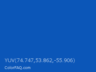 YUV 74.747,53.862,-55.906 Color is a normal blue color and the nearest color is Sapphire #0f52ba. Hex code #0b56b8 and RGB value is rgb(11,86,184). In RGB color space, this color is composed of 4% red, 34% green, 72% blue, In CMYK color space, this color is composed of 94% cyan, 53% magenta, 0% yellow , 28% black , In HSL color space, this color has a hue angle of 214° , 89% saturation and 38% lightness.