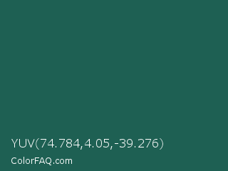 YUV 74.784,4.05,-39.276 Color is a dark cyan color and the nearest color is Eden #105852. Hex code #1e6053 and RGB value is rgb(30,96,83). In RGB color space, this color is composed of 12% red, 38% green, 33% blue, In CMYK color space, this color is composed of 69% cyan, 0% magenta, 14% yellow , 62% black , In HSL color space, this color has a hue angle of 168° , 52% saturation and 25% lightness.