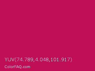 YUV 74.789,4.048,101.917 Color is a normal rose color and the nearest color is Pictorial Carmine #c30b4e. Hex code #bf0e53 and RGB value is rgb(191,14,83). In RGB color space, this color is composed of 75% red, 5% green, 33% blue, In CMYK color space, this color is composed of 0% cyan, 93% magenta, 57% yellow , 25% black , In HSL color space, this color has a hue angle of 337° , 86% saturation and 40% lightness.