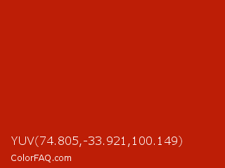 YUV 74.805,-33.921,100.149 Color is a normal red color and the nearest color is International Orange Engineering #ba160c. Hex code #bd1e06 and RGB value is rgb(189,30,6). In RGB color space, this color is composed of 74% red, 12% green, 2% blue, In CMYK color space, this color is composed of 0% cyan, 84% magenta, 97% yellow , 26% black , In HSL color space, this color has a hue angle of 8° , 94% saturation and 38% lightness.