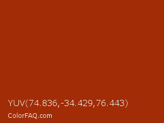 YUV 74.836,-34.429,76.443 Color is a normal color and the nearest color is Tabasco #a02712. Hex code #a22c05 and RGB value is rgb(162,44,5). In RGB color space, this color is composed of 64% red, 17% green, 2% blue, In CMYK color space, this color is composed of 0% cyan, 73% magenta, 97% yellow , 36% black , In HSL color space, this color has a hue angle of 15° , 94% saturation and 33% lightness.