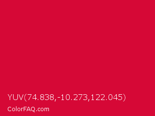 YUV 74.838,-10.273,122.045 Color is a normal red color and the nearest color is Utah Crimson #d3003f. Hex code #d60836 and RGB value is rgb(214,8,54). In RGB color space, this color is composed of 84% red, 3% green, 21% blue, In CMYK color space, this color is composed of 0% cyan, 96% magenta, 75% yellow , 16% black , In HSL color space, this color has a hue angle of 347° , 93% saturation and 44% lightness.