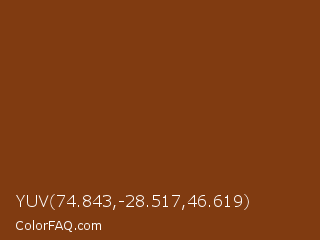 YUV 74.843,-28.517,46.619 Color is a dark orange color and the nearest color is Copper Canyon #7e3a15. Hex code #803b11 and RGB value is rgb(128,59,17). In RGB color space, this color is composed of 50% red, 23% green, 7% blue, In CMYK color space, this color is composed of 0% cyan, 54% magenta, 87% yellow , 50% black , In HSL color space, this color has a hue angle of 23° , 77% saturation and 28% lightness.