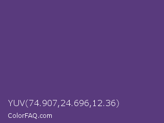 YUV 74.907,24.696,12.36 Color is a normal violet color and the nearest color is Cyber Grape #58427c. Hex code #593a7d and RGB value is rgb(89,58,125). In RGB color space, this color is composed of 35% red, 23% green, 49% blue, In CMYK color space, this color is composed of 29% cyan, 54% magenta, 0% yellow , 51% black , In HSL color space, this color has a hue angle of 268° , 37% saturation and 36% lightness.