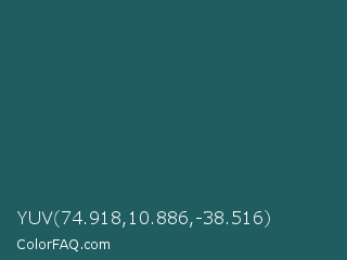 YUV 74.918,10.886,-38.516 Color is a dark cyan color and the nearest color is Casal #2f6168. Hex code #1f5d61 and RGB value is rgb(31,93,97). In RGB color space, this color is composed of 12% red, 36% green, 38% blue, In CMYK color space, this color is composed of 68% cyan, 4% magenta, 0% yellow , 62% black , In HSL color space, this color has a hue angle of 184° , 52% saturation and 25% lightness.