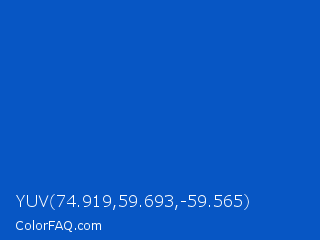 YUV 74.919,59.693,-59.565 Color is a normal blue color and the nearest color is Sapphire #0f52ba. Hex code #0756c4 and RGB value is rgb(7,86,196). In RGB color space, this color is composed of 3% red, 34% green, 77% blue, In CMYK color space, this color is composed of 96% cyan, 56% magenta, 0% yellow , 23% black , In HSL color space, this color has a hue angle of 215° , 93% saturation and 40% lightness.