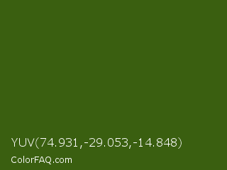 YUV 74.931,-29.053,-14.848 Color is a very dark green color and the nearest color is Dell #396413. Hex code #3a5f10 and RGB value is rgb(58,95,16). In RGB color space, this color is composed of 23% red, 37% green, 6% blue, In CMYK color space, this color is composed of 39% cyan, 0% magenta, 83% yellow , 63% black , In HSL color space, this color has a hue angle of 88° , 71% saturation and 22% lightness.