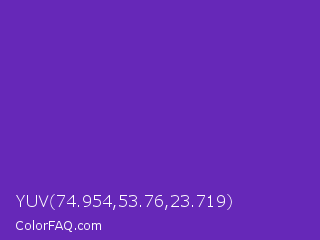 YUV 74.954,53.76,23.719 Color is a normal violet color and the nearest color is Purple Heart Crayola #652dc1. Hex code #6628b8 and RGB value is rgb(102,40,184). In RGB color space, this color is composed of 40% red, 16% green, 72% blue, In CMYK color space, this color is composed of 45% cyan, 78% magenta, 0% yellow , 28% black , In HSL color space, this color has a hue angle of 266° , 64% saturation and 44% lightness.