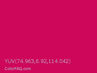 YUV 74.963,6.92,114.042 Color is a normal rose color and the nearest color is Rubine Red #d10056. Hex code #cd0659 and RGB value is rgb(205,6,89). In RGB color space, this color is composed of 80% red, 2% green, 35% blue, In CMYK color space, this color is composed of 0% cyan, 97% magenta, 57% yellow , 20% black , In HSL color space, this color has a hue angle of 335° , 94% saturation and 41% lightness.