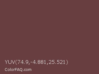 YUV 74.9,-4.881,25.521 Color is a normal red color and the nearest color is Roast Coffee #704241. Hex code #683e41 and RGB value is rgb(104,62,65). In RGB color space, this color is composed of 41% red, 24% green, 25% blue, In CMYK color space, this color is composed of 0% cyan, 40% magenta, 38% yellow , 59% black , In HSL color space, this color has a hue angle of 356° , 25% saturation and 33% lightness.