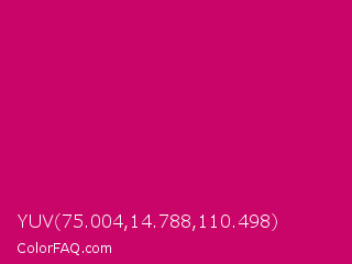 YUV 75.004,14.788,110.498 Color is a normal rose color and the nearest color is Rubine Red #d10056. Hex code #c90569 and RGB value is rgb(201,5,105). In RGB color space, this color is composed of 79% red, 2% green, 41% blue, In CMYK color space, this color is composed of 0% cyan, 98% magenta, 48% yellow , 21% black , In HSL color space, this color has a hue angle of 329° , 95% saturation and 40% lightness.