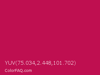 YUV 75.034,2.448,101.702 Color is a normal rose color and the nearest color is Pictorial Carmine #c30b4e. Hex code #bf0f50 and RGB value is rgb(191,15,80). In RGB color space, this color is composed of 75% red, 6% green, 31% blue, In CMYK color space, this color is composed of 0% cyan, 92% magenta, 58% yellow , 25% black , In HSL color space, this color has a hue angle of 338° , 85% saturation and 40% lightness.