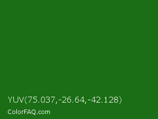 YUV 75.037,-26.64,-42.128 Color is a dark green color and the nearest color is Japanese Laurel #0a6906. Hex code #1b6e15 and RGB value is rgb(27,110,21). In RGB color space, this color is composed of 11% red, 43% green, 8% blue, In CMYK color space, this color is composed of 75% cyan, 0% magenta, 81% yellow , 57% black , In HSL color space, this color has a hue angle of 116° , 68% saturation and 26% lightness.