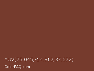 YUV 75.045,-14.812,37.672 Color is a normal red color and the nearest color is Nutmeg #81422c. Hex code #763b2d and RGB value is rgb(118,59,45). In RGB color space, this color is composed of 46% red, 23% green, 18% blue, In CMYK color space, this color is composed of 0% cyan, 50% magenta, 62% yellow , 54% black , In HSL color space, this color has a hue angle of 12° , 45% saturation and 32% lightness.