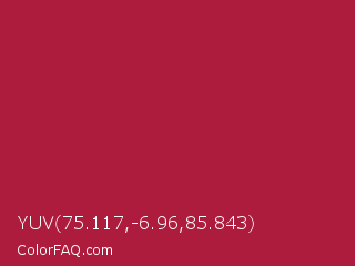 YUV 75.117,-6.96,85.843 Color is a normal red color and the nearest color is Deep Carmine #a9203e. Hex code #ad1c3d and RGB value is rgb(173,28,61). In RGB color space, this color is composed of 68% red, 11% green, 24% blue, In CMYK color space, this color is composed of 0% cyan, 84% magenta, 65% yellow , 32% black , In HSL color space, this color has a hue angle of 346° , 72% saturation and 39% lightness.