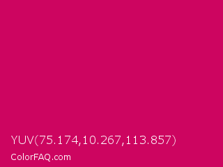 YUV 75.174,10.267,113.857 Color is a normal rose color and the nearest color is Rubine Red #d10056. Hex code #cd0560 and RGB value is rgb(205,5,96). In RGB color space, this color is composed of 80% red, 2% green, 38% blue, In CMYK color space, this color is composed of 0% cyan, 98% magenta, 53% yellow , 20% black , In HSL color space, this color has a hue angle of 333° , 95% saturation and 41% lightness.
