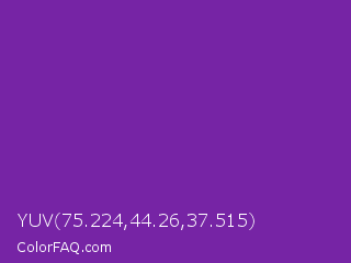 YUV 75.224,44.26,37.515 Color is a normal purple color and the nearest color is Grape #6f2da8. Hex code #7624a5 and RGB value is rgb(118,36,165). In RGB color space, this color is composed of 46% red, 14% green, 65% blue, In CMYK color space, this color is composed of 28% cyan, 78% magenta, 0% yellow , 35% black , In HSL color space, this color has a hue angle of 278° , 64% saturation and 39% lightness.