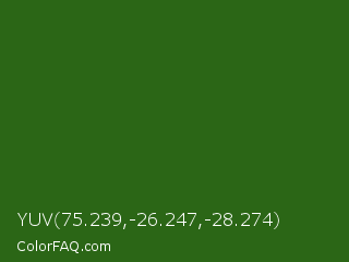 YUV 75.239,-26.247,-28.274 Color is a dark green color and the nearest color is Dell #396413. Hex code #2b6616 and RGB value is rgb(43,102,22). In RGB color space, this color is composed of 17% red, 40% green, 9% blue, In CMYK color space, this color is composed of 58% cyan, 0% magenta, 78% yellow , 60% black , In HSL color space, this color has a hue angle of 104° , 65% saturation and 24% lightness.