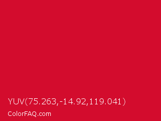 YUV 75.263,-14.92,119.041 Color is a normal red color and the nearest color is Lava #cf1020. Hex code #d30c2d and RGB value is rgb(211,12,45). In RGB color space, this color is composed of 83% red, 5% green, 18% blue, In CMYK color space, this color is composed of 0% cyan, 94% magenta, 79% yellow , 17% black , In HSL color space, this color has a hue angle of 350° , 89% saturation and 44% lightness.