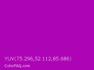 YUV 75.296,52.112,85.686 Color is a normal magenta color and the nearest color is Heliotrope Magenta #aa00bb. Hex code #ad05b5 and RGB value is rgb(173,5,181). In RGB color space, this color is composed of 68% red, 2% green, 71% blue, In CMYK color space, this color is composed of 4% cyan, 97% magenta, 0% yellow , 29% black , In HSL color space, this color has a hue angle of 297° , 95% saturation and 36% lightness.