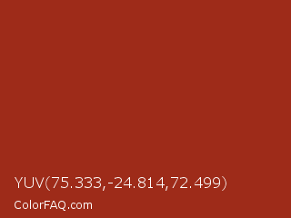 YUV 75.333,-24.814,72.499 Color is a normal red color and the nearest color is Tabasco #a02712. Hex code #9e2b19 and RGB value is rgb(158,43,25). In RGB color space, this color is composed of 62% red, 17% green, 10% blue, In CMYK color space, this color is composed of 0% cyan, 73% magenta, 84% yellow , 38% black , In HSL color space, this color has a hue angle of 8° , 73% saturation and 36% lightness.