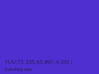 YUV 75.335,65.897,4.091 Color is a normal indigo color and the nearest color is Purple Heart Crayola #652dc1. Hex code #502fd1 and RGB value is rgb(80,47,209). In RGB color space, this color is composed of 31% red, 18% green, 82% blue, In CMYK color space, this color is composed of 62% cyan, 78% magenta, 0% yellow , 18% black , In HSL color space, this color has a hue angle of 252° , 64% saturation and 50% lightness.
