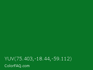 YUV 75.403,-18.44,-59.112 Color is a dark green color and the nearest color is La Salle Green #087830. Hex code #087526 and RGB value is rgb(8,117,38). In RGB color space, this color is composed of 3% red, 46% green, 15% blue, In CMYK color space, this color is composed of 93% cyan, 0% magenta, 68% yellow , 54% black , In HSL color space, this color has a hue angle of 137° , 87% saturation and 25% lightness.