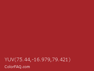 YUV 75.44,-16.979,79.421 Color is a normal red color and the nearest color is Mexican Red #a72525. Hex code #a62429 and RGB value is rgb(166,36,41). In RGB color space, this color is composed of 65% red, 14% green, 16% blue, In CMYK color space, this color is composed of 0% cyan, 78% magenta, 75% yellow , 35% black , In HSL color space, this color has a hue angle of 358° , 64% saturation and 40% lightness.