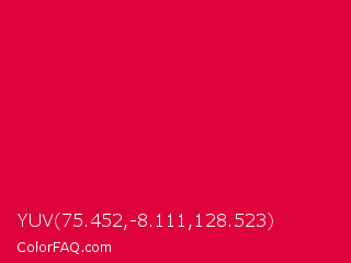 YUV 75.452,-8.111,128.523 Color is a normal red color and the nearest color is Rich Carmine #d70040. Hex code #de043b and RGB value is rgb(222,4,59). In RGB color space, this color is composed of 87% red, 2% green, 23% blue, In CMYK color space, this color is composed of 0% cyan, 98% magenta, 73% yellow , 13% black , In HSL color space, this color has a hue angle of 345° , 96% saturation and 44% lightness.
