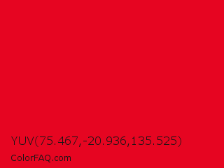 YUV 75.467,-20.936,135.525 Color is a normal red color and the nearest color is Cadmium Red #e30022. Hex code #e60521 and RGB value is rgb(230,5,33). In RGB color space, this color is composed of 90% red, 2% green, 13% blue, In CMYK color space, this color is composed of 0% cyan, 98% magenta, 86% yellow , 10% black , In HSL color space, this color has a hue angle of 353° , 96% saturation and 46% lightness.
