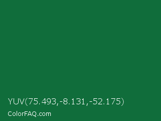 YUV 75.493,-8.131,-52.175 Color is a dark green color and the nearest color is Jewel #126b40. Hex code #106d3b and RGB value is rgb(16,109,59). In RGB color space, this color is composed of 6% red, 43% green, 23% blue, In CMYK color space, this color is composed of 85% cyan, 0% magenta, 46% yellow , 57% black , In HSL color space, this color has a hue angle of 148° , 74% saturation and 25% lightness.